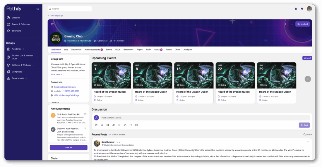 By unifying social features, event management, co-curricular tracking and more, Pathify’s Communities simplifies group administration, streamlines discovery and participation and strengthens belonging. With dynamic dashboards, gamified engagement and integrated messaging tools, Communities empowers campuses to connect users and drive collaboration — all in one easy-to-use platform.