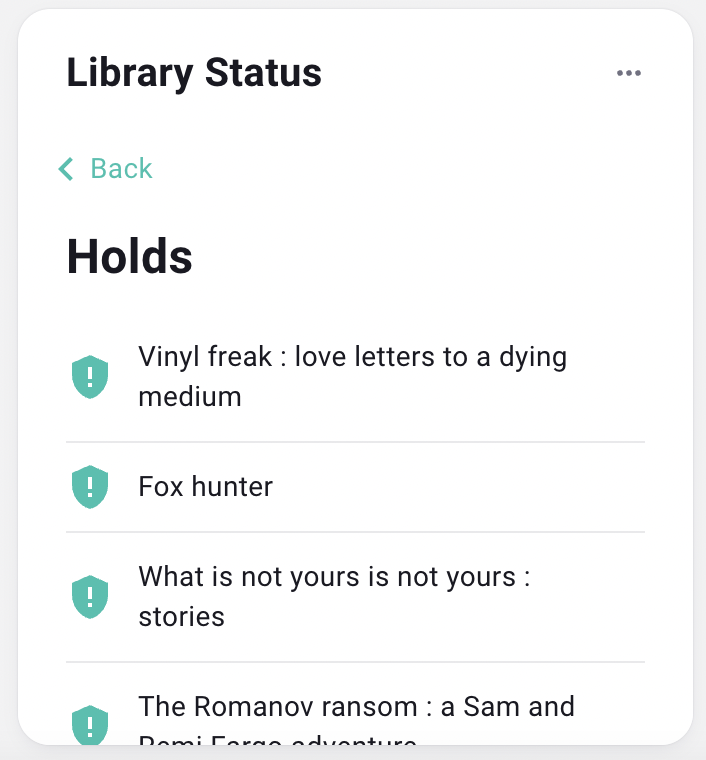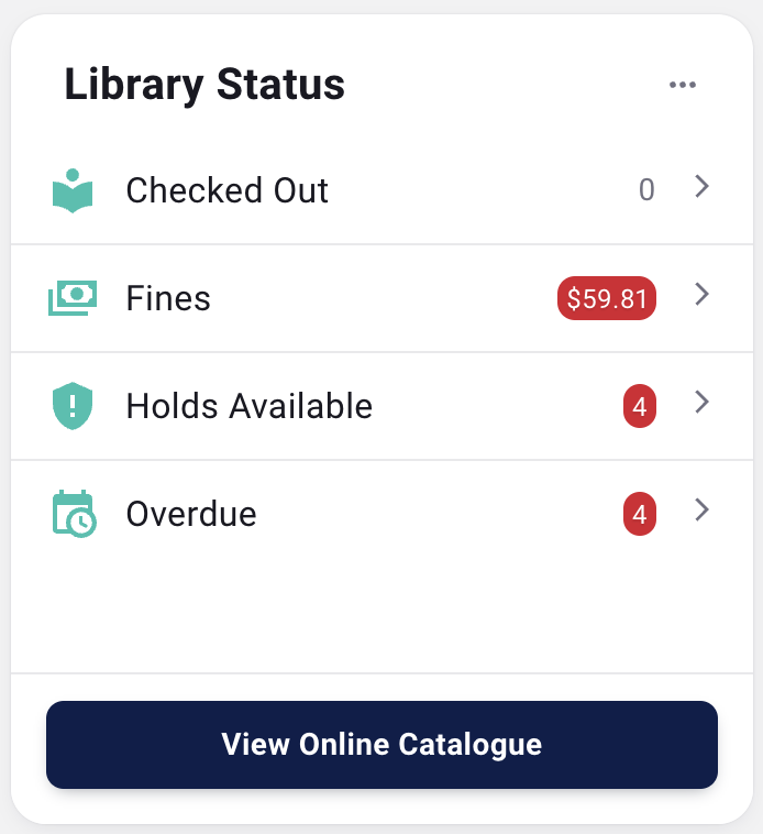 View currently checked-out books, overdue books (and associated fines) and any specific holds or restrictions applicable to an institution’s on-campus library. Data is pulled via API with the SirsiDynix Campus Library Connector.