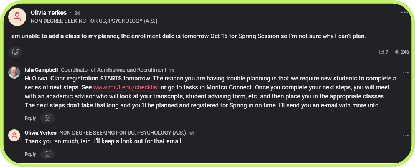 Montco Connect’s Groups balance fostering open dialogue and maintaining a respectful environment. Features like keyword monitoring and post reporting allow for quick responses to inappropriate content, with a designated Dean managing any escalations. “We’ve had Pathify for nearly five years and only a handful of issues with students using flagged keywords,” Angela Cavaliere, MCCC Assistant Director of Digital Experience explained. She emphasized students generally act respectfully and responsibly, understanding that the platform is tied to their university accounts. “We trust students to self-govern, as long as it aligns with the College’s code of conduct,” she added.